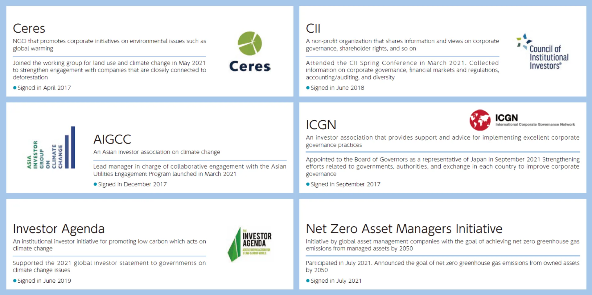 We conduct a variety of engagements on ESG challenges with companies around the world. Our stewardship activities are led by a dedicated team based in Tokyo, the UK and the US, working closely with our credit and equity research analysts. In addition to actively engaging directly with investee companies, we are also proactive signatories to a number of global and domestic ESG initiatives.